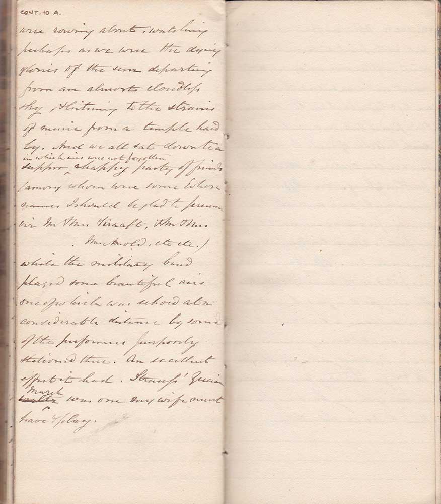 were rowing about watching perhaps as we were the dying glories of the sun departing from an almost cloudless sky & listening to the strains of music from a temple hard by. And as we all sat down to a supper in which ices were not forgotten a happy party of friends (among whom were some whose names I should be glad to preserve viz Mr & Mrs Kraaft, Mr & Mrs Mme Mold etc. etc.) while the military band played some beautiful airs one of which was echoed at a considerable distance by some of the performers purposely stationed there. An excellent effect it had. Strauss’s Grecian March was one my wife must have & play.