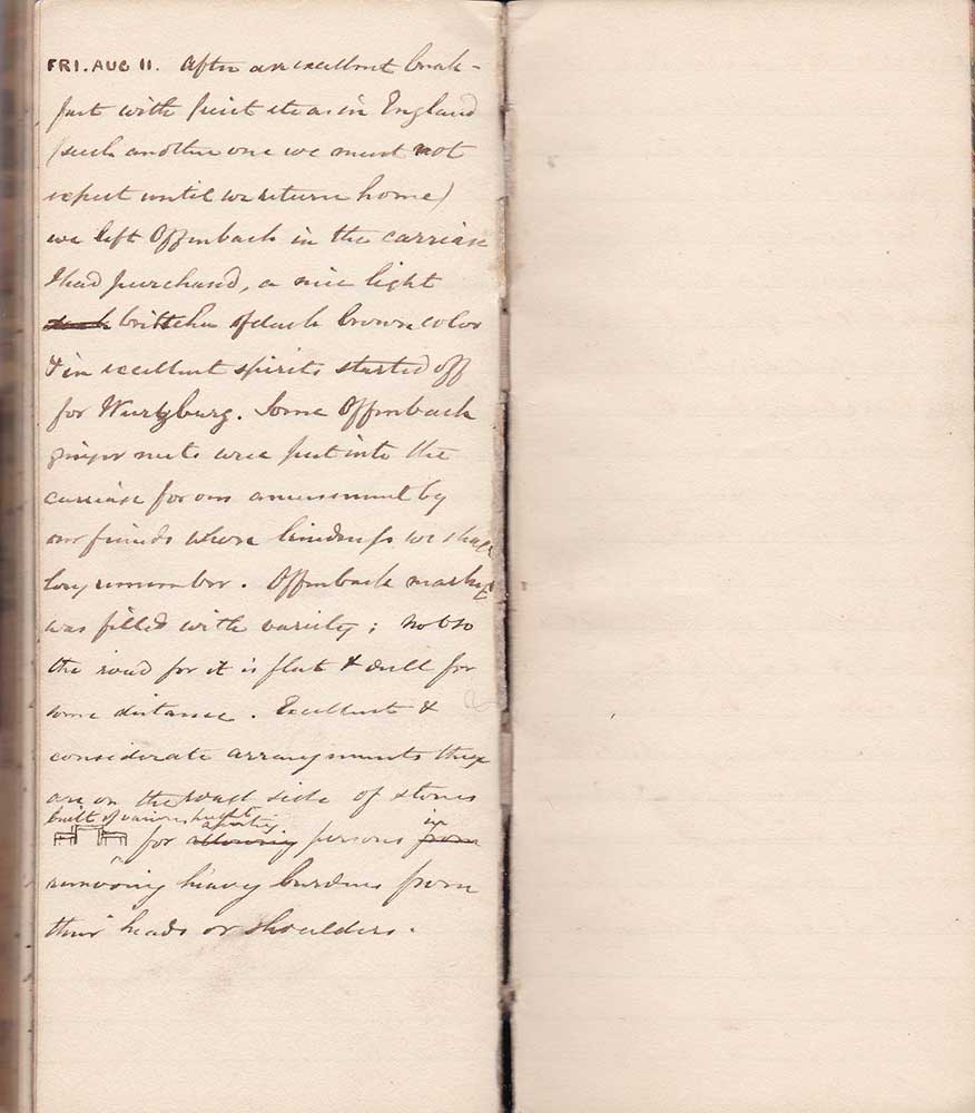 After an excellent breakfast with fruit etc. as in England (such another one we must not expect until we return home) we left Offenbach in the carriage I had purchased, a nice light ?britchen of dark brown color & in excellent spirits started off for Wurzburg. Some Offenbach ginger nuts were put into the carriage for our amusement by our friends whose kindness we shall long remember. Offenbach market was filled with variety; not so the road for it is flat & dull for some distance. Excellent & considerate arrangements there are on the road side of stories built of various heights[small pen drawing of steps like prize winners' podium at athletics' games.] for assisting persons in removing heavy burdens from their heads or shoulders.