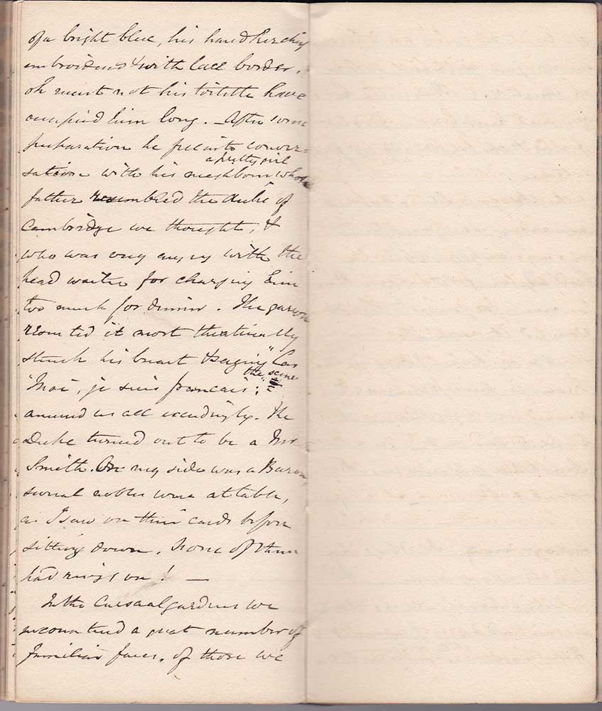 of a bright blue, his handkerchief embroidered & with lace border. Oh must not his toilette have occupied him long. - After some preparation he fell into conversation with his neighbour a pretty girl whose father resembled the duke of Cambridge we thought, & who was very angry with the head waiter for charging him too much for dinner. The garcon re?counted it most theatrically struck his breast & saying “[ ] Moi, je suis francais”; the scene amused us all exceedingly. The Duke turned out to be a Mr Smith. On my side was a Baron, several nobles were at table, as I saw on their cards before sitting down. None of them had rings on! –