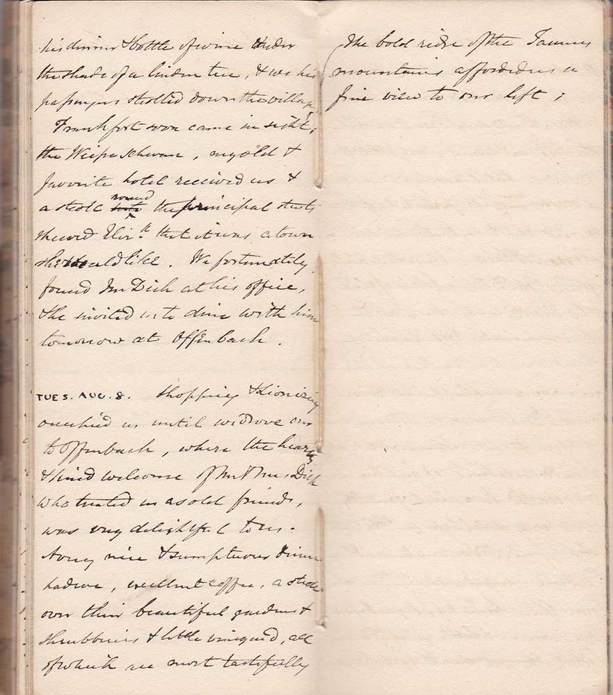 TUES. AUG. 8 Shopping & lionising occupied us until we drove over to Offenbach, where the hearty & kind welcome of Mr & Mrs Dick who treated us an old friends, was very delightful to us. A very nice & sumptuous dinner had we, excellent coffee, a stroll over their beautiful gardens & shrubberies & little vineyard, all of which are most tastefully