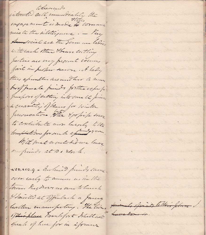 interested call to leave cards immediately the engagement is made & thus communicate the intelligence. – Very social are the German ladies with each other & bean cutting parties are very frequent excuses for it in proper season. A lady thus assembles around her a number of female friends for the express purpose of cutting into small pieces a quantity of beans for winter preservation, but tea & gossip serve to contribute more largely to the temptation for such a rendezvous.