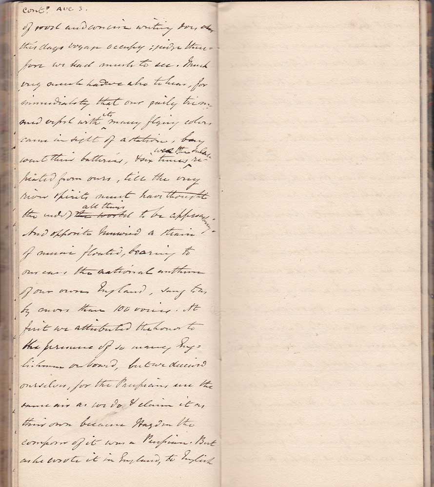 of good and concise writing does this days voyage occupy; judge therefore that we had much to see. Much very much also had we to hear, for immediately that our gaily trimmed vessel with its many flying colors, came in sight of a station, bang went their batteries, & six times was the salute repeated from ours, till the very river spirits must have thought the end of all things to be approaching. And opposite Neuwied a strain of music floated, bearing to our ears the national anthem of our own England, sung to us by more than a 100 voices. At first we attributed the honor to the presence of so many Englishmen board, but we deceived ourselves for the Prussians use the same air as we do & claim it as their own because Hayden the composer of it was a Prussian. But as he wrote it in England, to English
