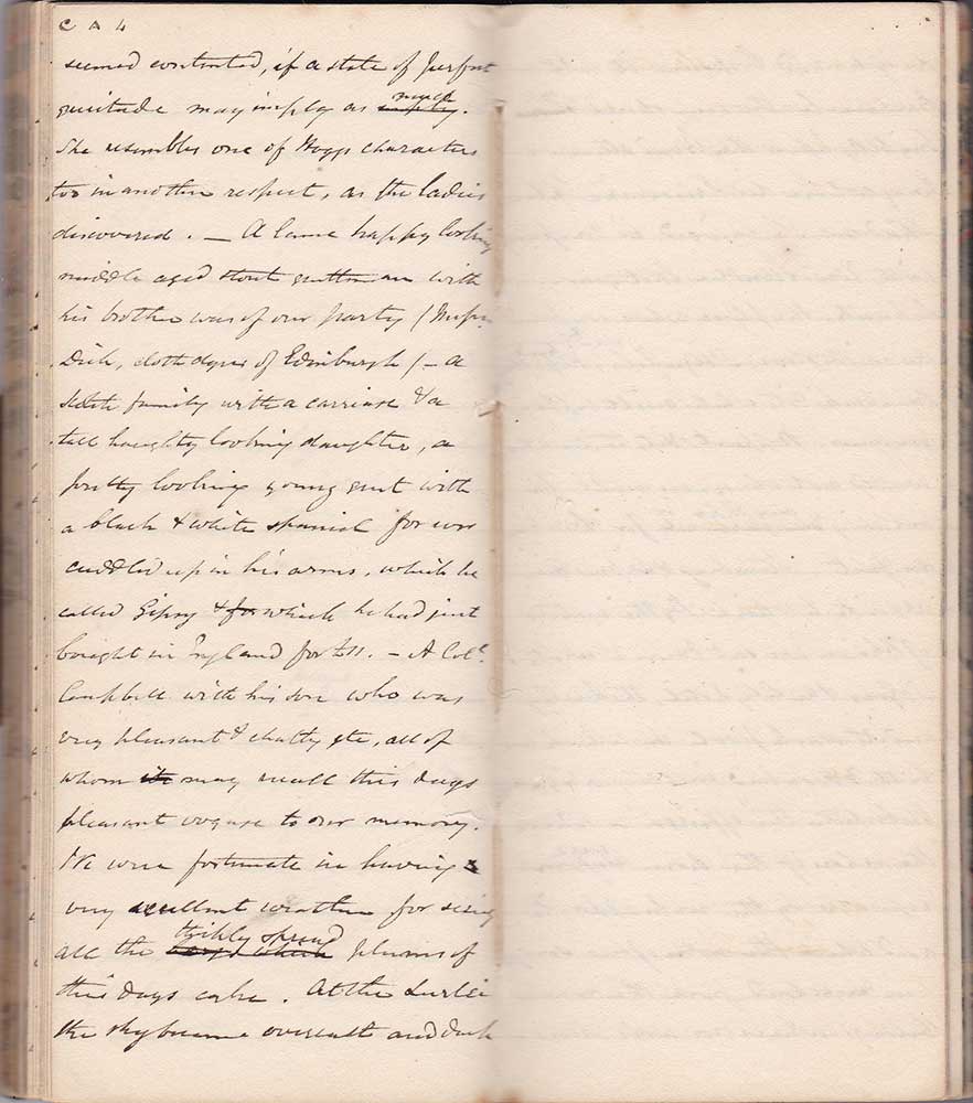 seemed contented, if a state of perfect quietude may imply as much. She resembles one of Hoggs characters too in another respect, as the ladies discovered. – A lame happy looking middle aged stout gentleman with his brother was of our party /[?] Dick, cloth dyer of Edinburgh/ a Scotch family with a carriage & and a tall haughty looking daughter, a pretty looking young gent with a black & white spaniel forever cuddled up in his arms, which he called Gipsy, & which he had just bought in England for £11. A Coll Campbell with his son who was very pleasant & chatty etc, all of whom may recall this days pleasant voyage to our memory. We were fortunate in having very excellent weather for seeing all the thickly spread plums of this days cake. At the Lorlei the sky became overcast and dark