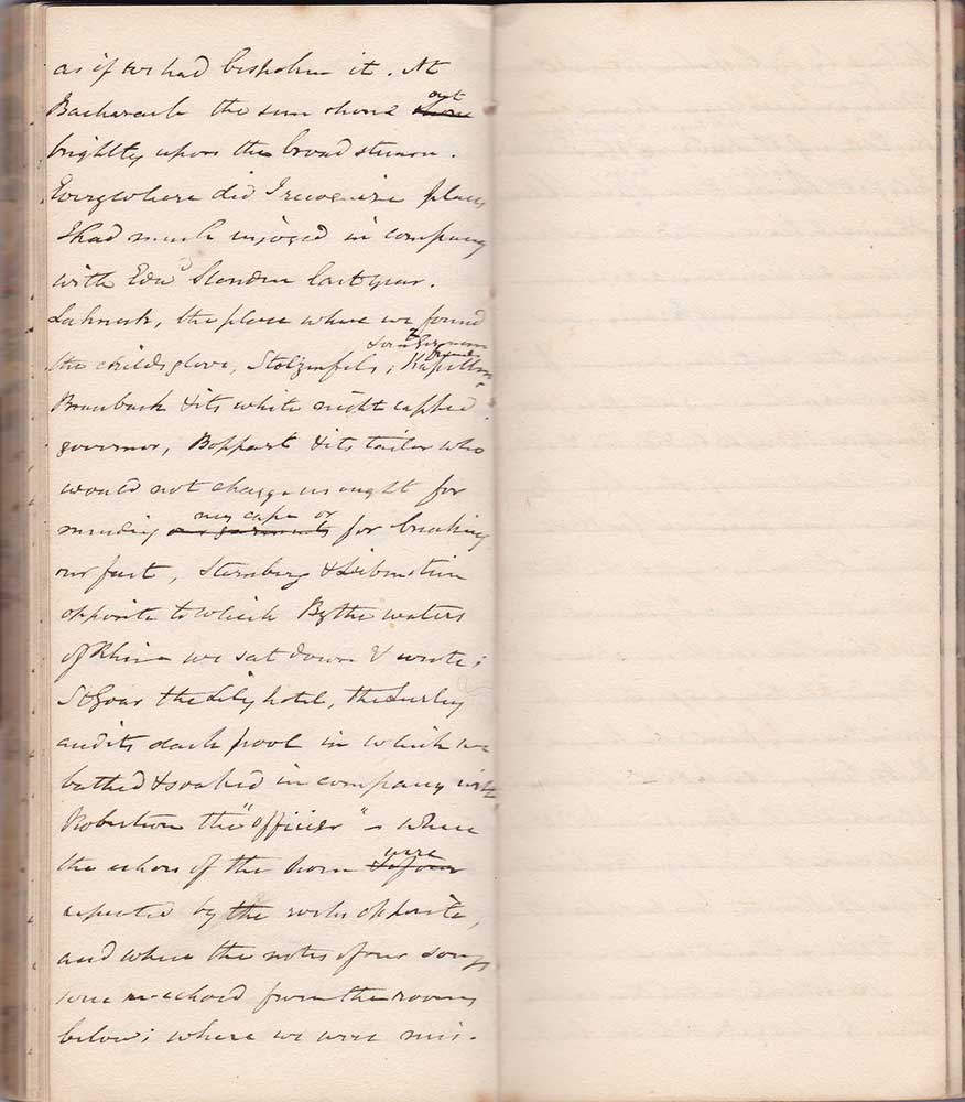Lahneck, the place where we found the childs glove, Stolzenfels, Kapellen & our 2 German friends, Braubach & its white night capped governor, Boppart & its tailor who would not charge us ought for mending my cape or for breaking our fast, Sternberg & Liebenstein opposite to which by the waters of the Rhine we sat down & wrote; St Goar the Lily Hotel, the Lurley and its dark pool in which we bathed & soaked in company with Robertson the ‘officier’ – where the echoes of the horn were repeated by the rocks opposite, and where the notes of our song were re-echoed from the rooms below; where we were mis-
