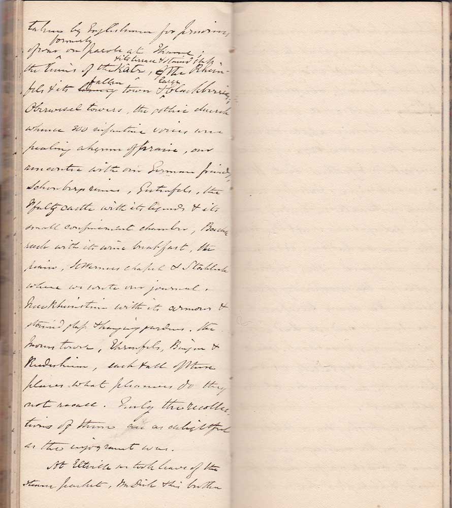 taken by Englishmen for Prussians for prisoners of war formerly on parole at Thame; the ruins of the Katz & its terrace & stained glass, the Rheinfels & its fallen tower & the large blackberries; Oberwesel towers, the gothic church whence 300 infantine voices were pealing a hymn of praise, our rencontre with our German friends, Schonberg ruins, Gutenfels, the Pfaltz castle with its legends & its small confinement chamber, Bacharbach with its wine breakfast, the piano, St Werner’s chapel & Stahleck where we wrote our journal. Neu Rheinstein with its armours & stained glass & hanging gardens, the Mouse tower, Ehrenfels, Bingen, & Rudesheim each & all of those places what pleasures do they not recall. Truly the recollections of them are as delightful as the enjoyment was.